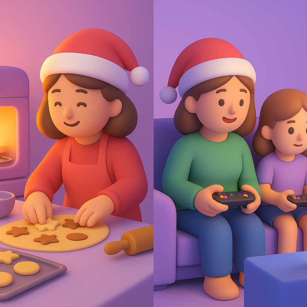 If it helps, create a simple “holiday digital plate” to guide your family’s rhythm. Not a rigid schedule, but a loose, cozy assortment of digital “food groups” that keeps things balanced: